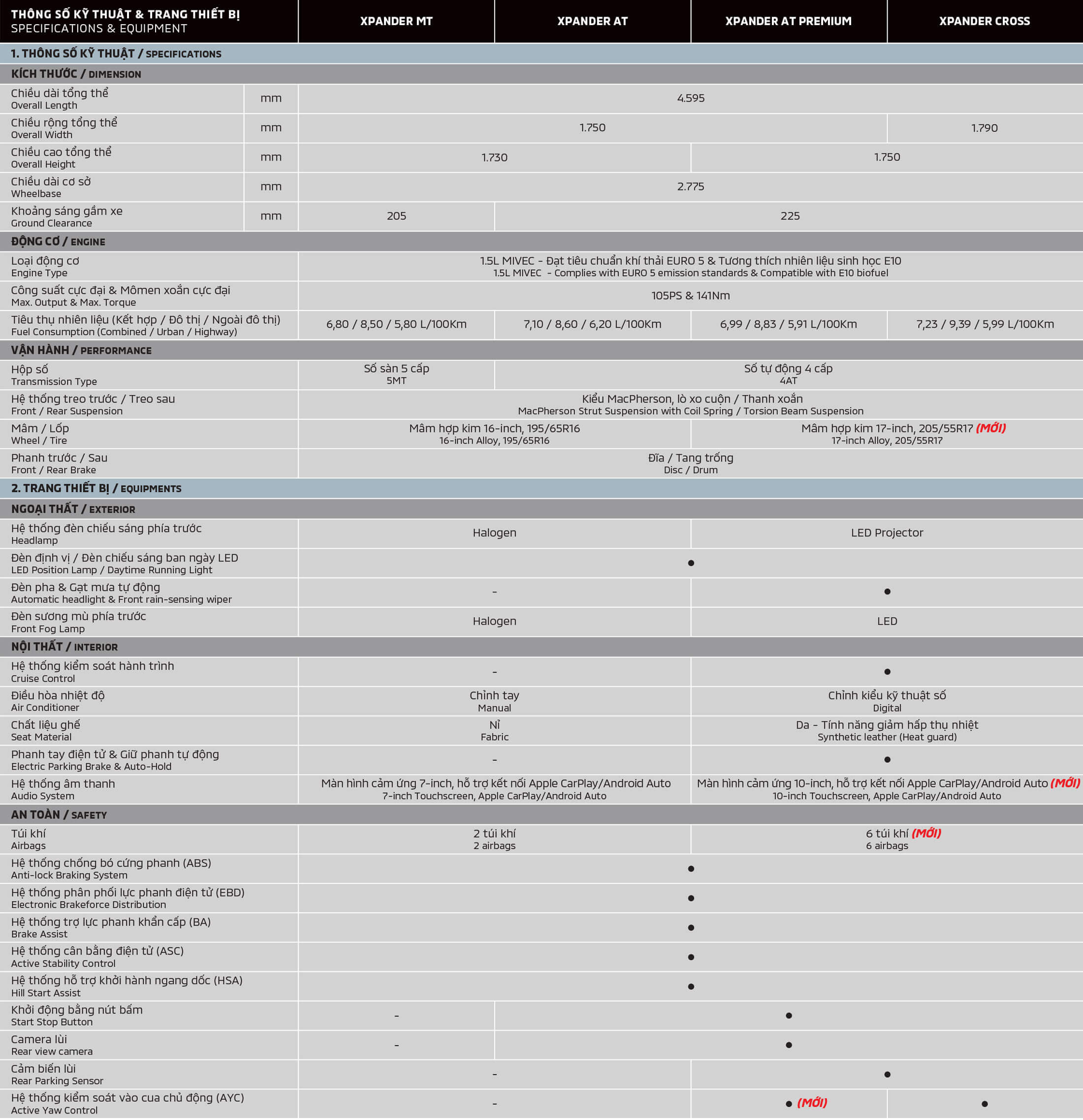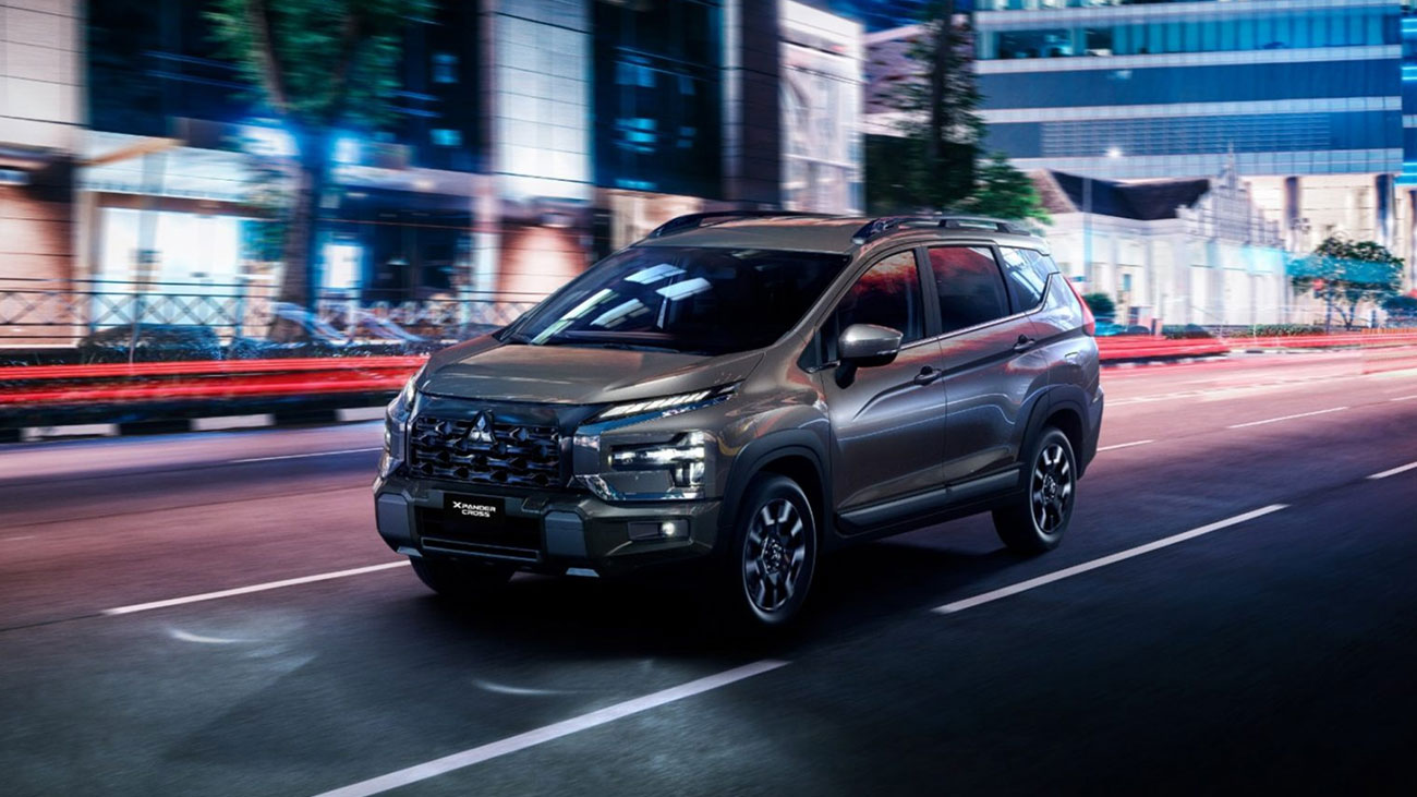 Mitsubishi Xpander Cross 2025 mới, mẫu xe SUV mạnh mẽ, vững chãi và hiện đại với thiết kế lưới tản nhiệt, cản trước, cản sau và mâm xe 17 inch hoàn toàn mới; nội thất đẳng cấp, rộng rãi với màn hình người lái 8 inch, màn hình giải trí 10 inch kết nối không dây, vô lăng 3 chấu mới cùng trang bị 6 túi khí và hệ thống kiểm soát vào cua chủ động (AYC).